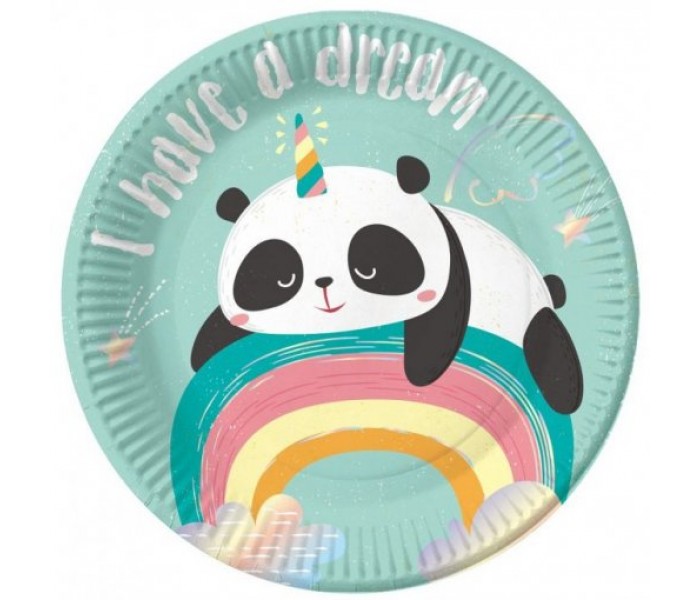 PRATOS DESCARTAVEIS EM PAPEL TEMA PANDA ARCO-IRIS