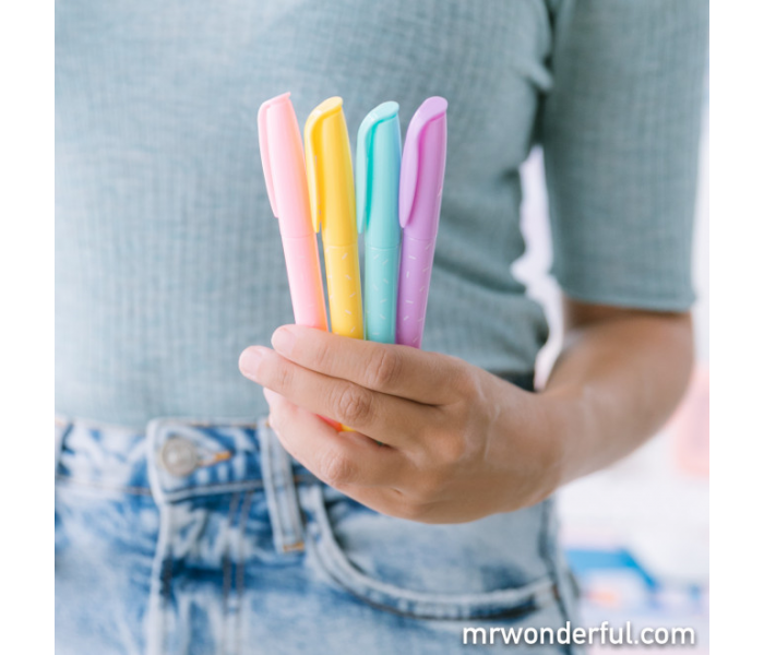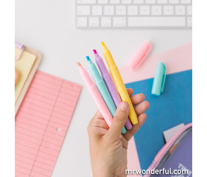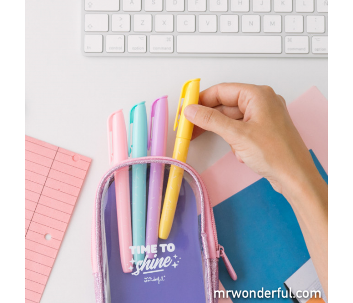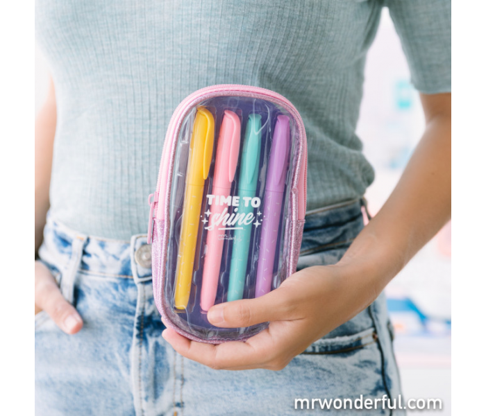 Set de 4 marcadores em tons pastel. Incluem estojo feito de PVC.