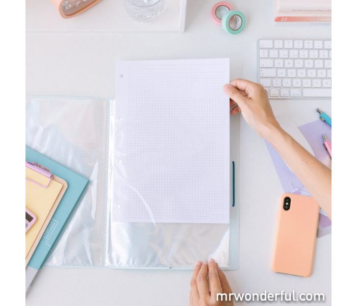 Como podes ver nas fotos, estamos a falar de uma pasta com folhas transparentes para que possas organizar todos os teus papéis para tê-los sempre à mão e sempre à vista. As folhas transparentes servem como separadores e vão fazer com que seja super fácil encontrar os documentos que procuras. E além de ser super prática e de ser feita com acabamentos de qualidade, conta com algo que a torna diferente de produtos similares que existem no mercado: um desenho original e ao mais puro estilo wonder, e também uma frase motivacional que vai fazer com que tenhas um sorriso no rosto do início ao fim do ano letivo. No seu interior vais encontrar 30 folhas transparentes para arquivares todos os papéis que quiseres.