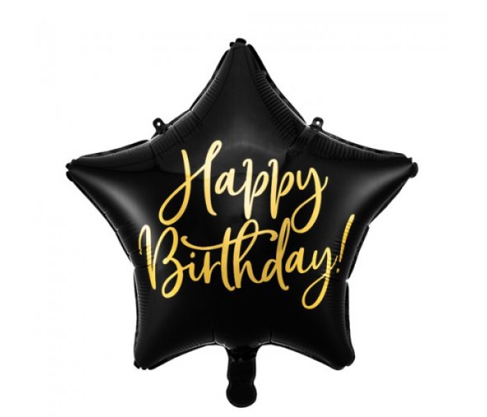 BALÃO METALIZADO ESTRELA PRETA COM HAPPY BIRTHDAY